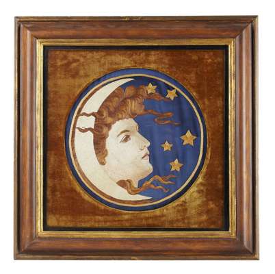 depicting the profile of a maiden with flowing hair against a starry sky, the roundel mounted in a velvet slip, framed