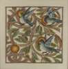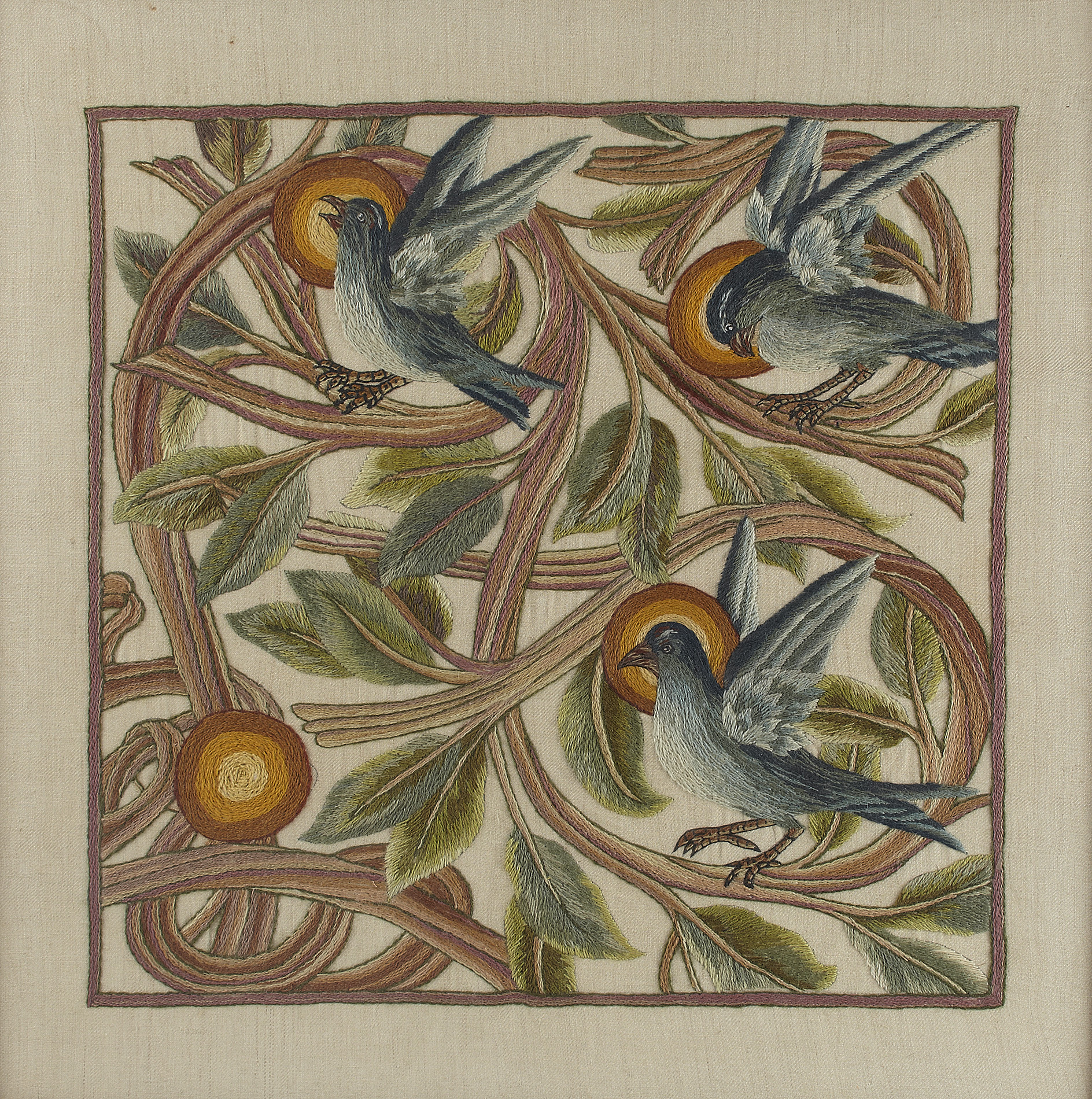 wool embroidery on linen ground depicting three blue birds amongst scrolling branches and leaves, framed and glazed