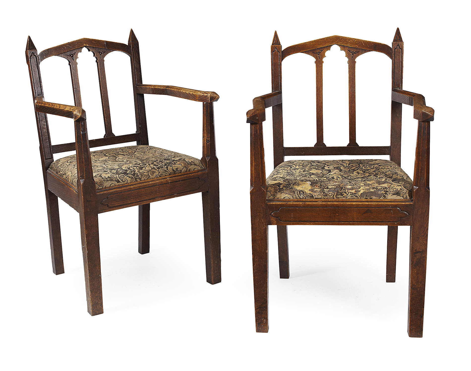 each with arcaded backs and angular open arms above drop-in seats and square panelled legs united by stretchers (2)