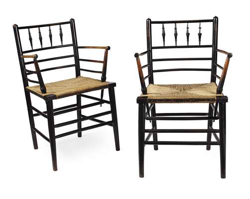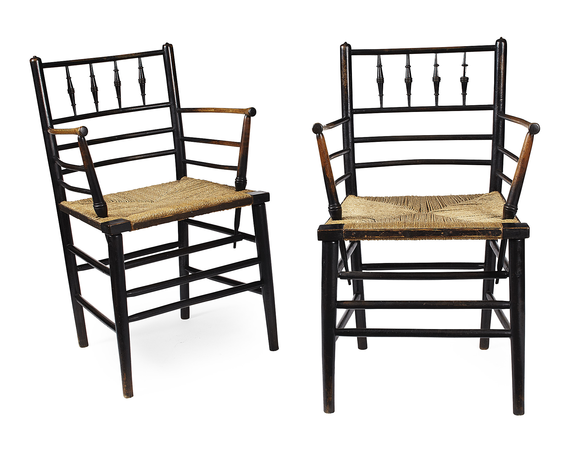 each with spindle filled backs, above open armed and rush seats, raised on turned legs, linked by stretchers (2)
