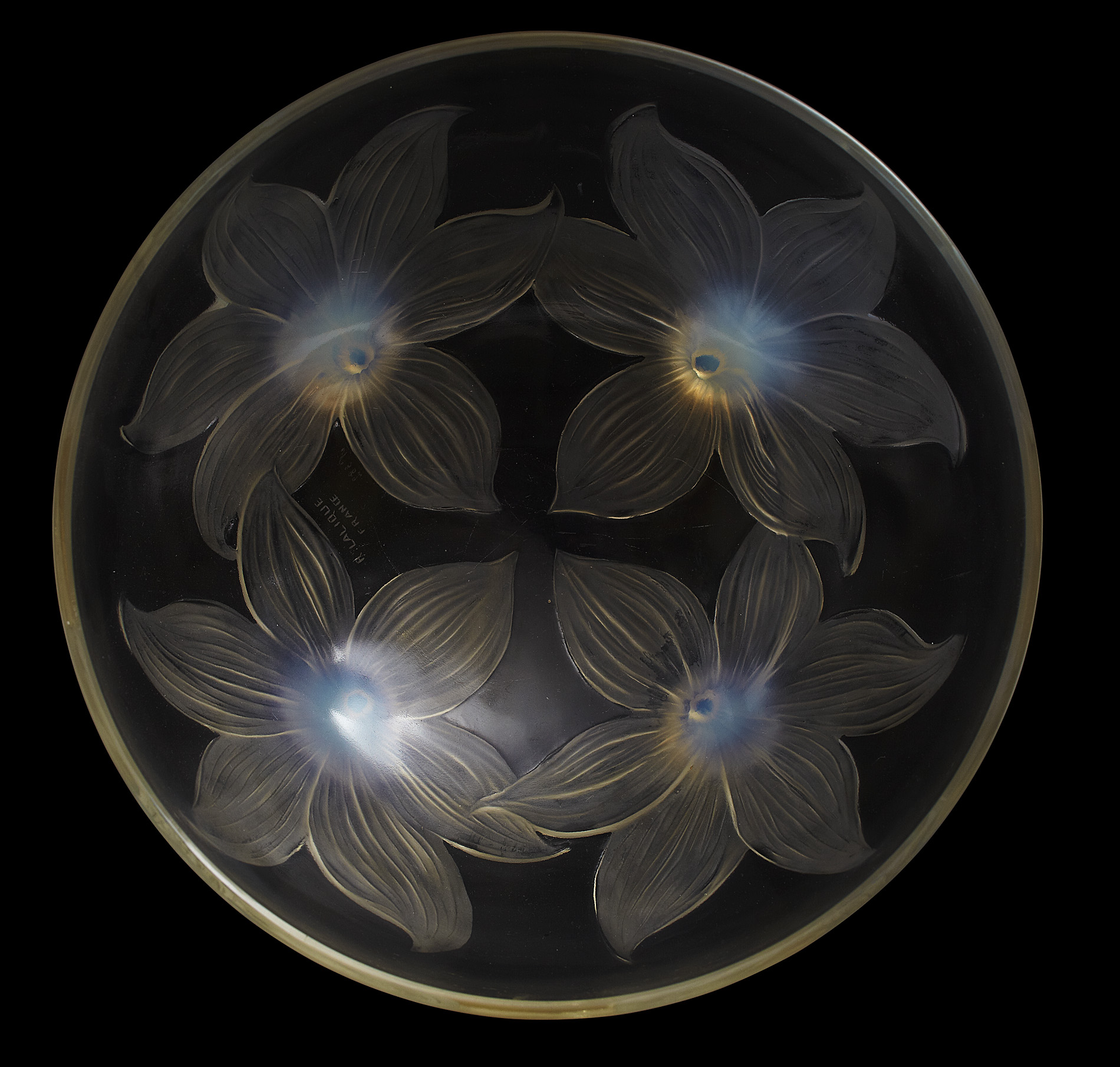 the circular bowl moulded with four lily flowers, their stems forming the feet, wheel etched mark R. LALIQUE/ FRANCE