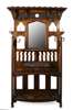 the corners with inlaid copper panel, embossed with the inscription FAIR WEATHER AFTER YOU, incorporating aperture for a clock (lacking), the arched central mirror enclosed by a series of scrolling coat hooks, above a marble top and single drawer, flanked by stick stands on square moulded feet