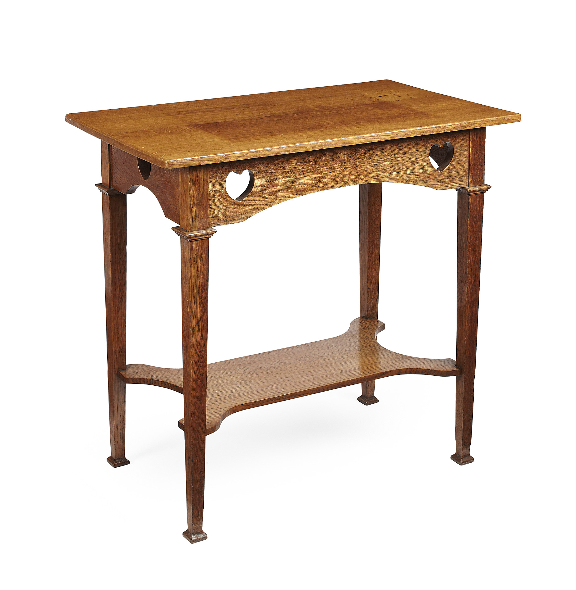 the rectangular top above a curved apron frieze pierced with hearts, raised on square tapering legs and joined by a shaped stretcher