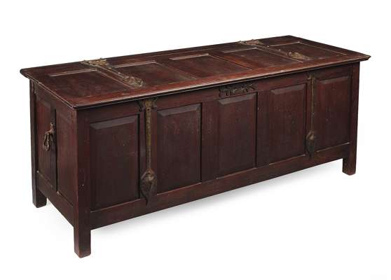 of rectangular outline with panelled hinged lid and sides, and with decorative iron hinges and side handles