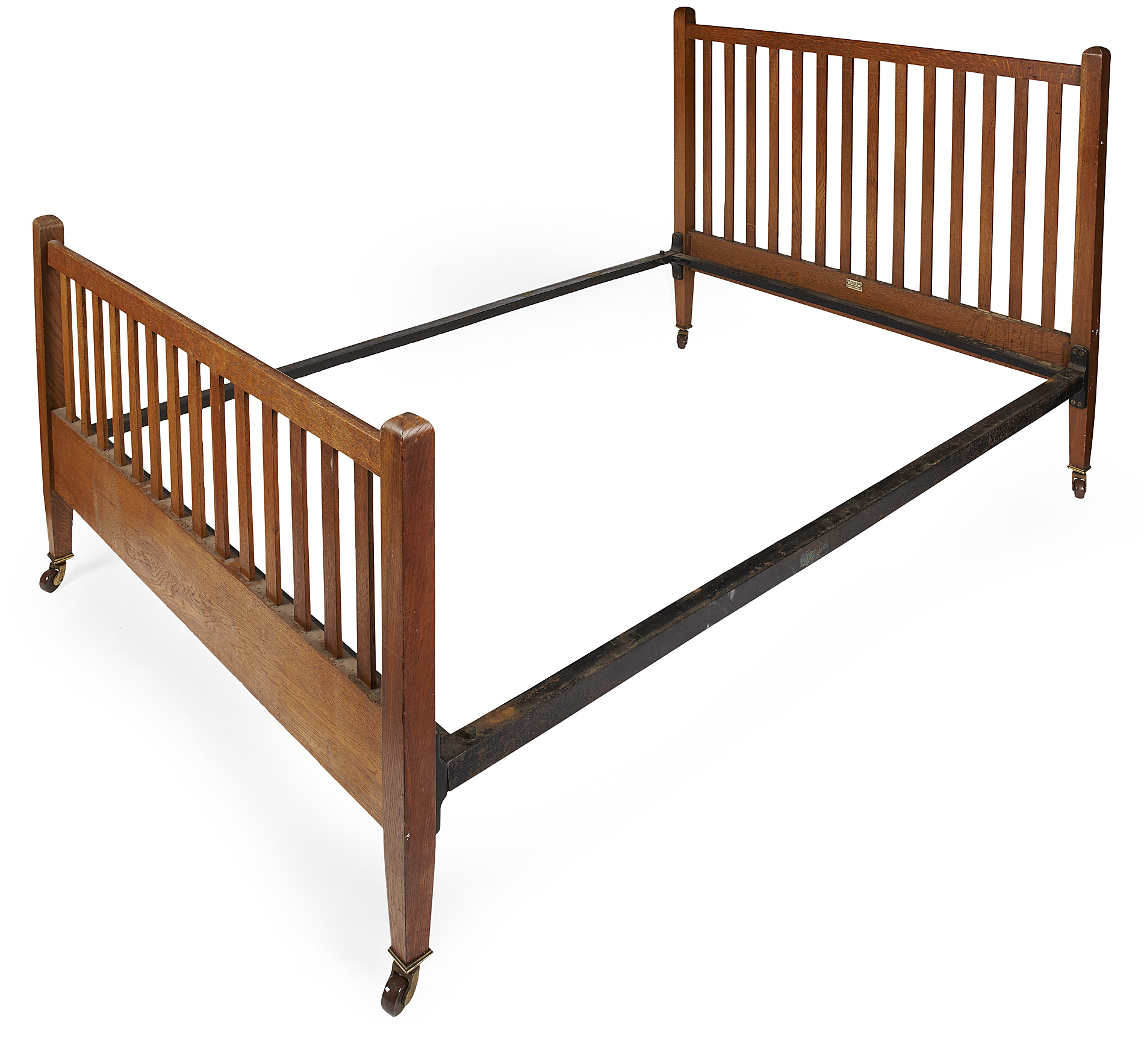 with slat filled head and foot board on square tapering legs, bears maker's label