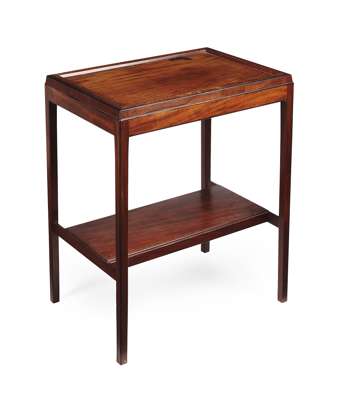 the rectangular top with inset panel, the frame with chevron bands and ebony inlaid line to the angle, above a plain frieze on square tapering legs linked by a lower tier, bears label MAHOGANY SQUARE TOP TABLE BY EDWARD BARNSLEY C.B.E./ OF FROXFIELD, PETERSFIELD, HANTS/ BOT. AT SALE OF MRS WALES' FURNITURE, AMBERLEY, GLOS, 1945/ 13/-/-