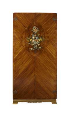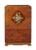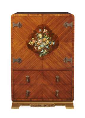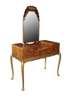 comprising a two door wardrobe with quarter veneered panel doors, painted with summer flowers, stamped marks R3065/ J4356/ U1651, 92cm wide; a DRESSING TABLE, the shaped swing mirror with floral painted surmount above an arrangement of five drawers, flower carved frieze raised on cabriole legs, stamped marks R3056/ J4357, 98cm wide, 155cm high, 51cm deep; and a COMPACTUM CHEST, with two flower painted doors enclosing a shelf above two drawers on bracket feet, stamped marks R3065/ J4358, 68cm wide, 106cm high, 43cm deep (3)