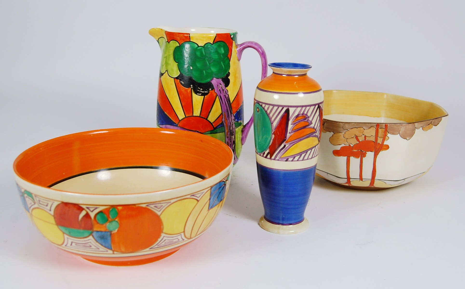 printed mark, 21cm diameter; CLARICE CLIFF 'TALL FIRS', OCTANGONAL BOWL, 1930s, printed factory marks, 20cm diameter; a CLARICE CLIFF 'FRUIT' SHOULDERED TAPERING VASE, printed factory marks, 18cm high (damage to rim); and a ROYAL WINTON 'DELHI' HAND PAINTED JUG, printed, moulded and painted marks 9033, 20cm high (4)