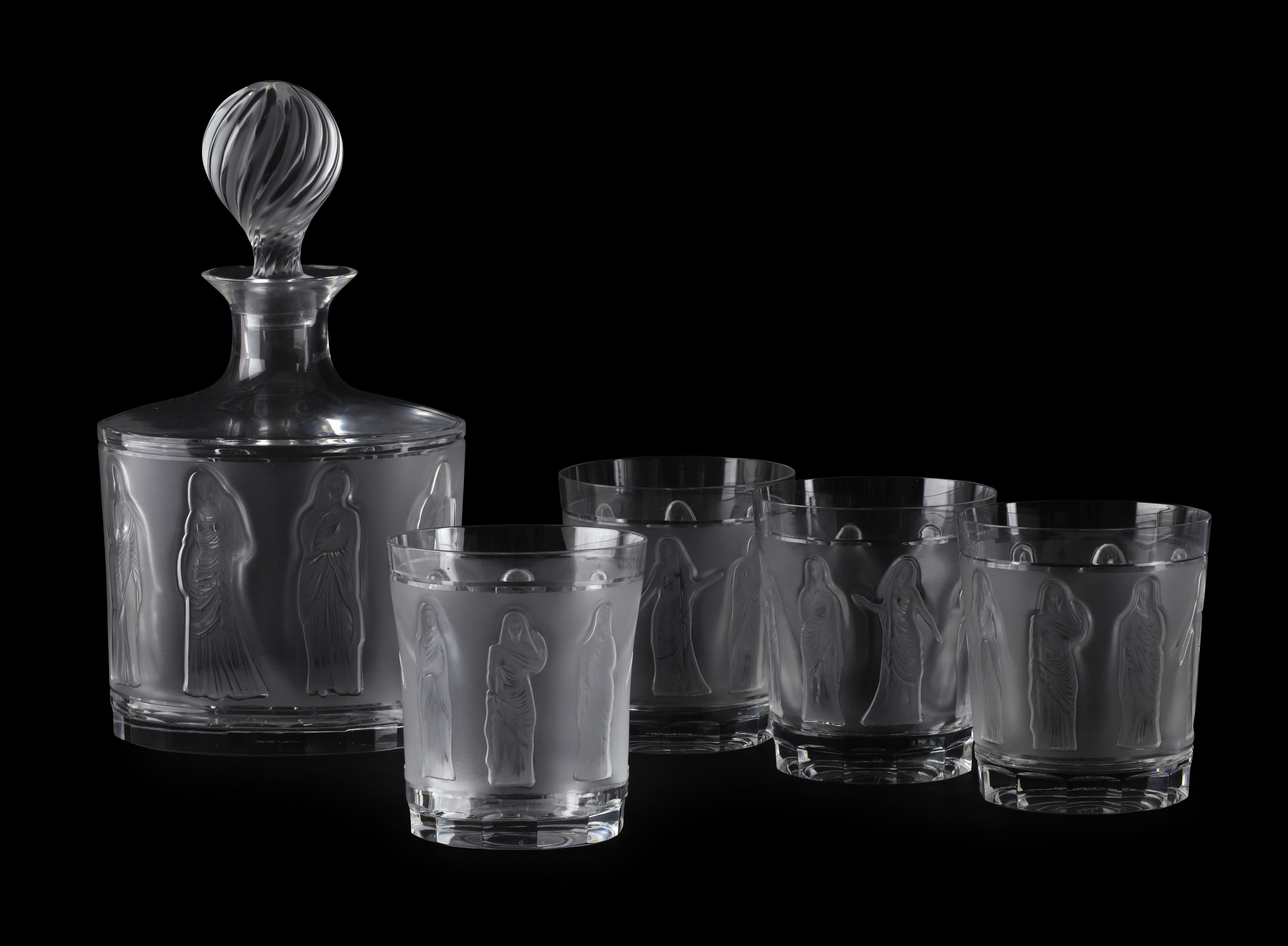 'FEMMES ANTIQUES' CLEAR AND FROSTED GLASS DECANTER SET, MID 20TH CENTURY