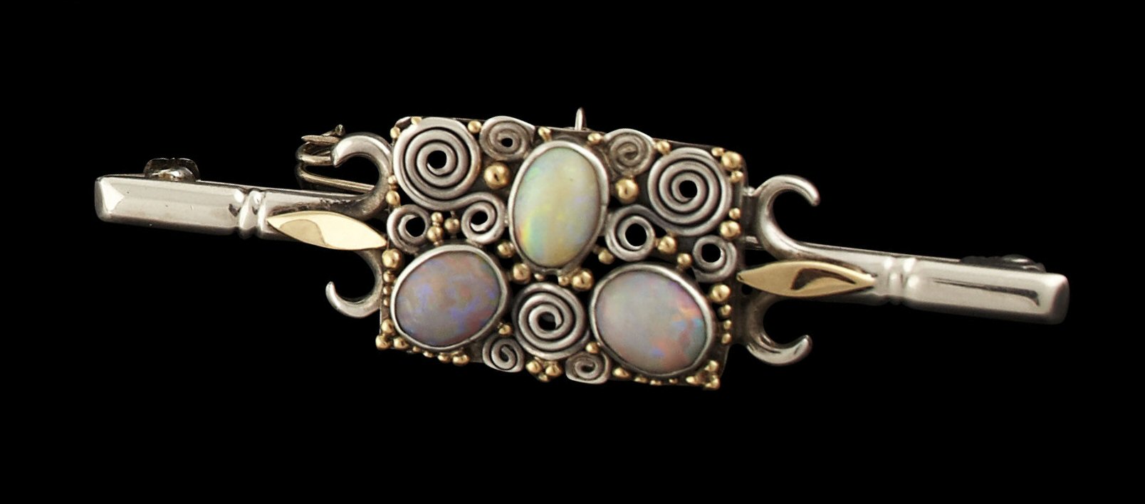 the central rectangular panel collet set with three slightly graduated oval cut opal cabochons, to a beaded and scrolling circular surround, flanked to either side by two-coloured scrolls with cylindrical terminals, hinged pin and additional safety chain