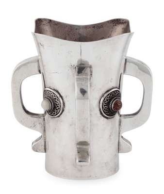 of tapered quatrefoil form with flared rim, the body set with four S-scroll handles and applied Celtic bosses with central hardstone cabochons, hallmarked Dublin 1904, stamped maker's marks S.D. NEILL/ SDN