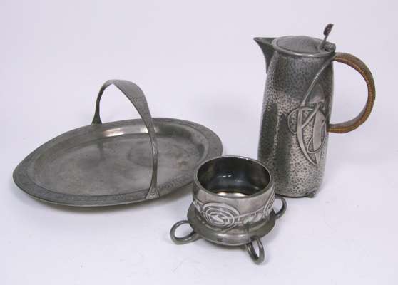 cast with stylised foliage on a hammered ground, stamped marks TUDRIC/ 0231, 22cm high; a 'TUDRIC' SUGAR BOWL, also designed by ARCHIBALD KNOX, with four hooped feet, stamped marks TUDRIC/0288, 15cm diameter; and a LIBERTY & CO PEWTER SINGLE HANDLED TRAY, stamped marks ENGLISH PEWTER MADE BY LIBERTY & CO/ 01202, 29.5cm across (3)