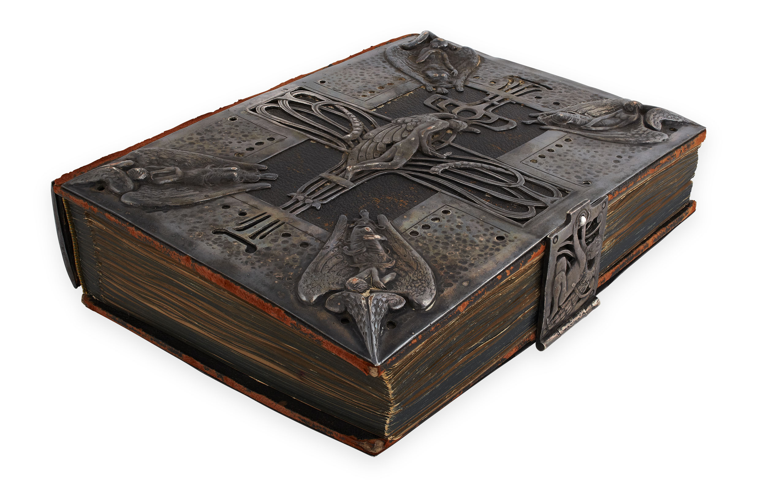 cast to each side with an allegorical figure of love watched over by spirits on each angle, and enclosing an album of photographs, engraved on the front, the back and the spine ART UNION OF LONDON 1ST JANUARY 1896