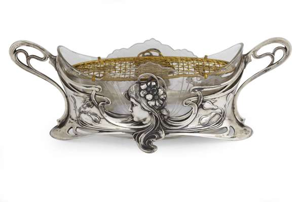 cast with whiplash foliage and mask, with clear cut glass liner and flower cage, stamped and cast marks no. 590