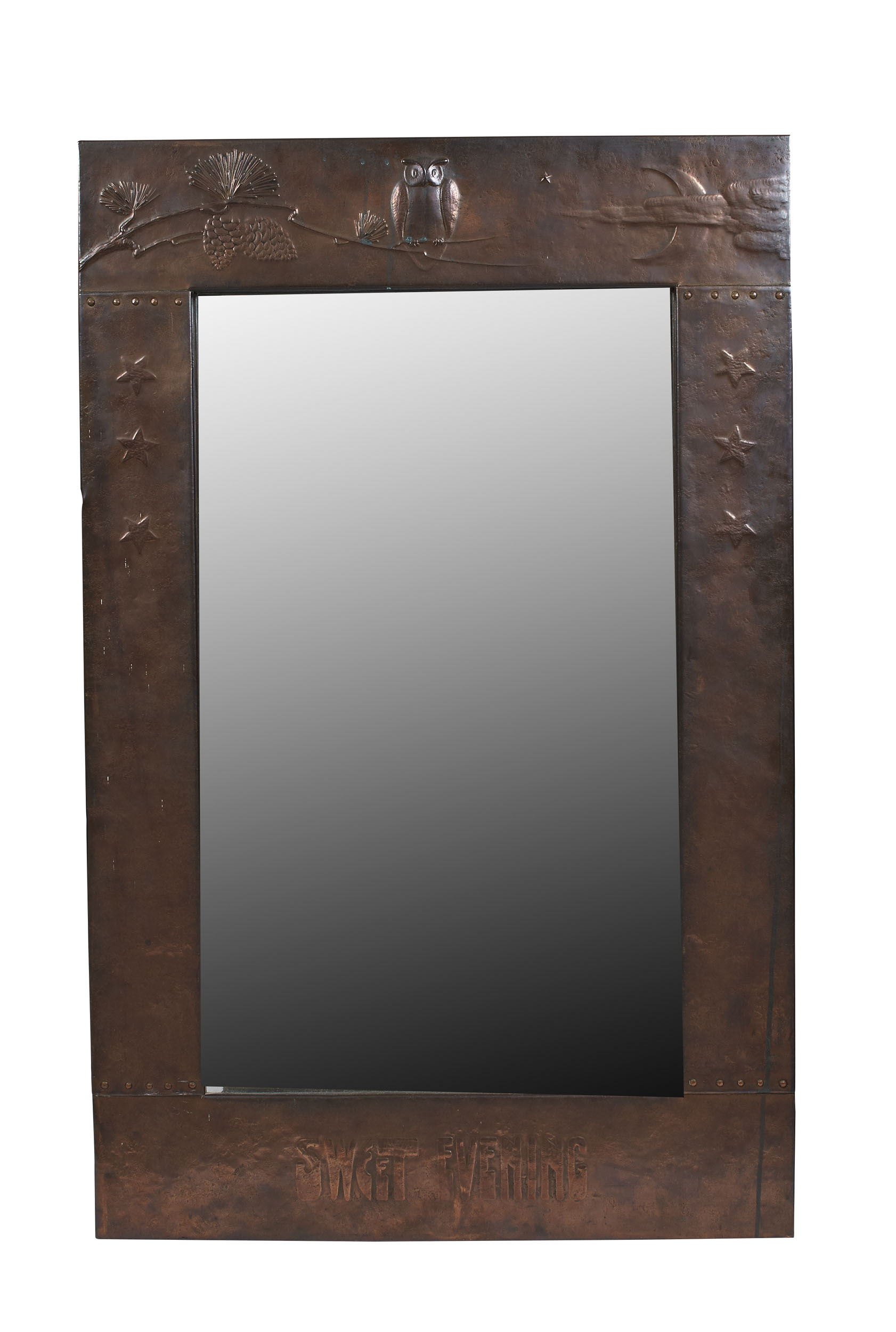 the rectangular frame with riveted panels, embossed with an owl on a branch and with inscription SWEET EVENING