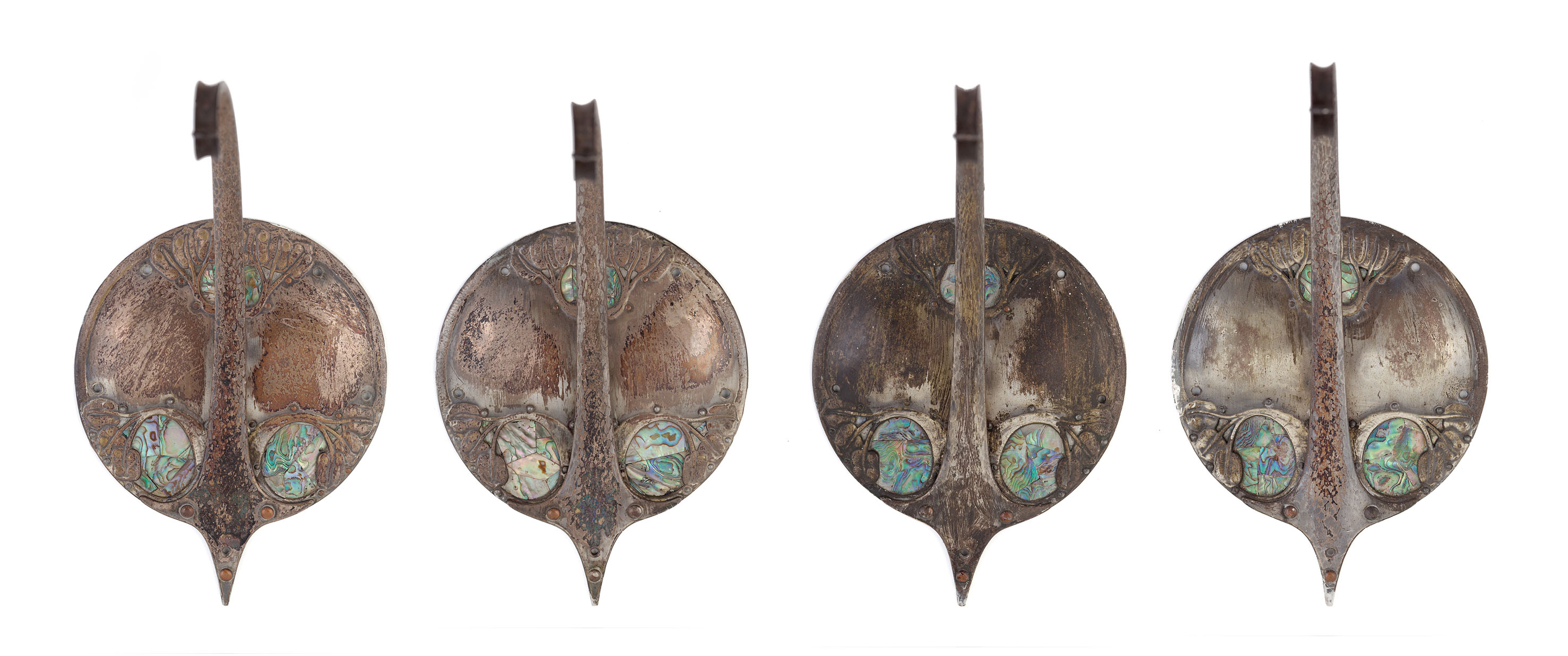 each with scrolled branches and circular wall plates inset with abalone shell and cast with honesty, with two original shades in Vaseline glass with silvered metal mounts (one shade cracked) (4)