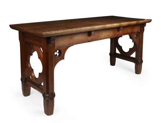 the rectangular top above plain frieze with lobed brackets, pierced with quatrefoil roundels, raised on canted square supports, with blind quatrefoil roundels