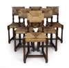 the rushed back supported on swollen cylindrical supports above corresponding rush seat on turned and blocked tapering legs, linked by stretchers and raised on flattened bun feet (6)
