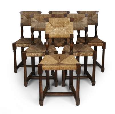 Note: These chairs were made for John Rowntree's cafe in Scarborough where Walton developed a new style of furniture based on the French 17th century 'caquetoire' style. This French renaissance style was popular in Scotland in the 16th century and the strong links between the two countries ensured the style flourished well into the 17th century. These chairs would still have been seen in the more aristocratic homes in Scotland in the late 19th century and Walton here has taken the basic form and adapted it with the use of rushing to lighten the effect of the construction.