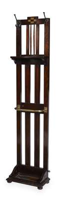 with checker inlaid stepped top rail with applied pegs above a brass rail for sticks with drip tray below, bears maker's label