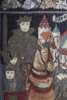 each chair surmounted with the carved figures of knights holding shields, above tall upholstered backs, each with heraldic embroidered panels in gros and petit point, the corresponding sprung seats above spirally fluted supports linked by a foliate carved stretcher (2)