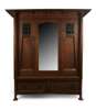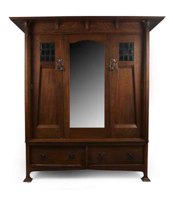 the projecting cornice with angular buttresses and square column supports, enclosing a central mirror flanked by two panelled doors above two drawers on square legs with broad spreading feet, bears retailer's label Marsh, Jones Cribb & Co.