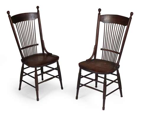 each with tapered spindle filled backs and solid seats raised on turned legs and linked by stretchers (2)