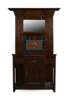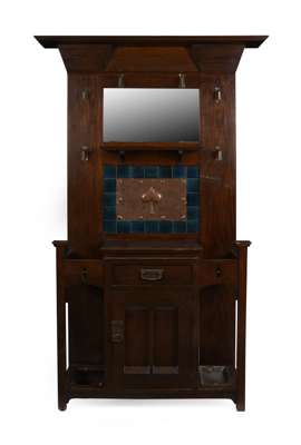 the projecting cornice with angular brackets, above central mirror and embossed copper panel with tiled splash back, drawer and panelled door, flanked by stick stands