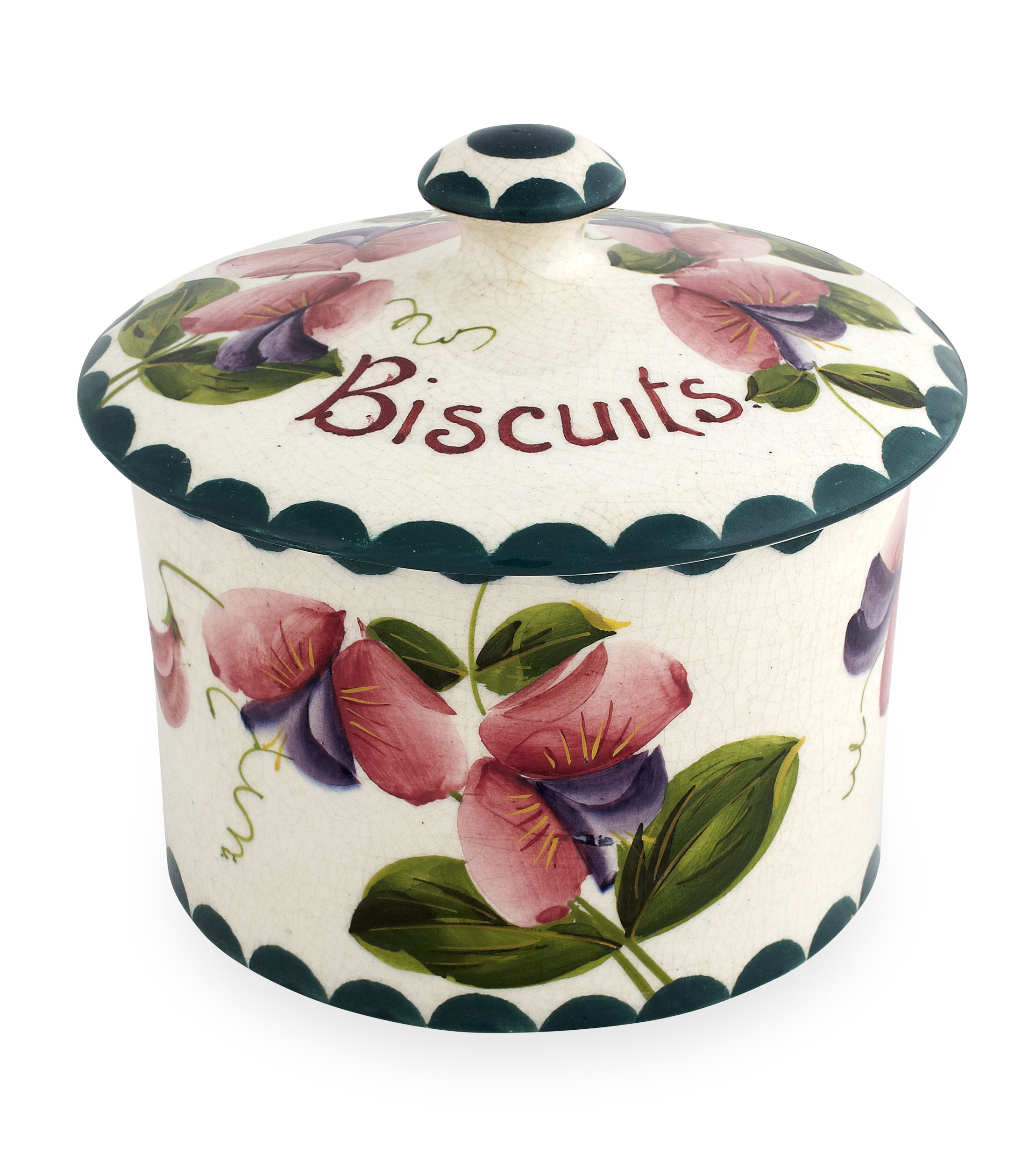 'SWEET PEAS' BISCUIT BARREL & COVER, CIRCA 1900