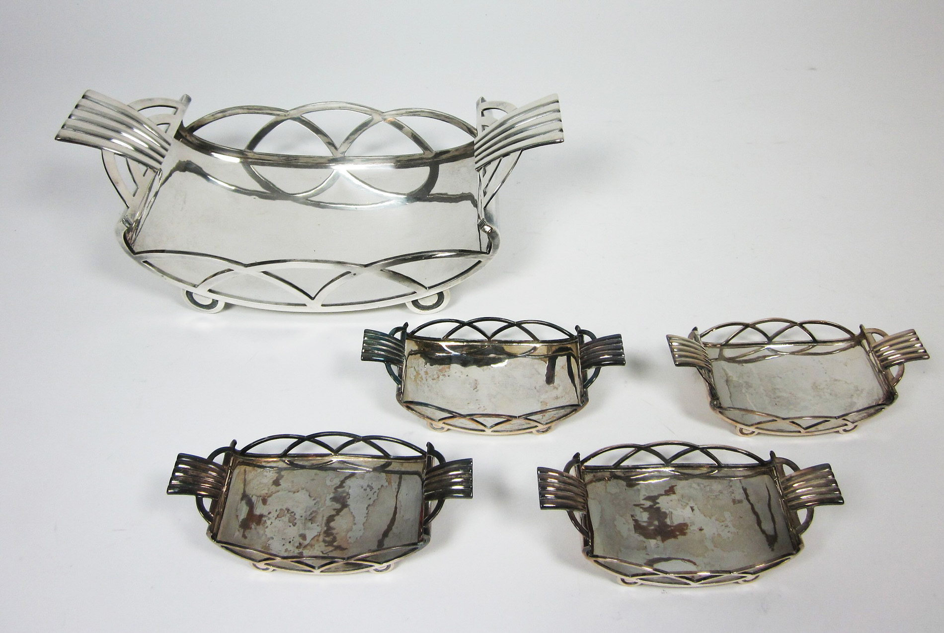 comprising a serving dish with twin finned handles and pierced gallery sides, and four matching serving dishes, impressed maker's marks, hallmarked Edinburgh 1938, 43oz (5)