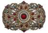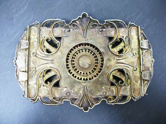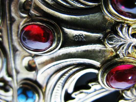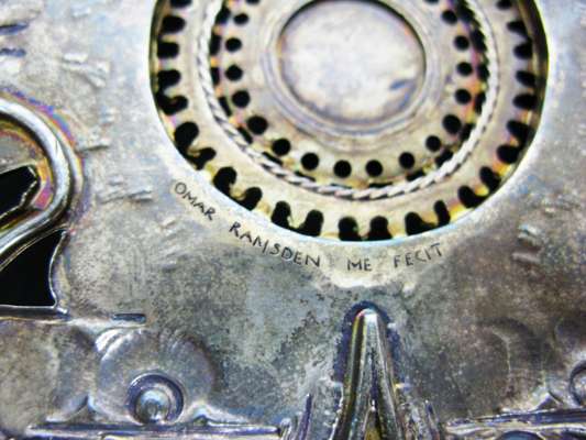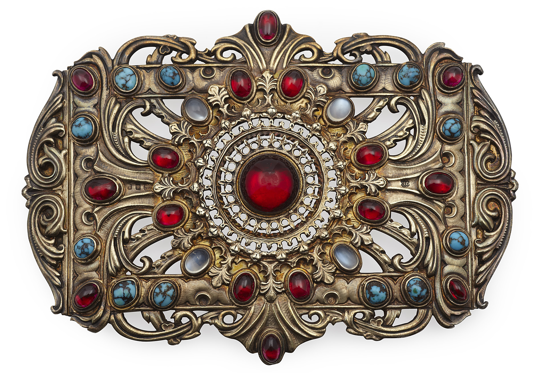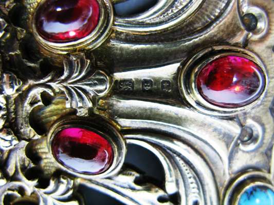 of elaborate pierced foliate design, set with turquoise and coloured cabochons and hinged to each end, bears inscription verso OMAR RAMSDEN ME FECIT, hallmarked London 1934