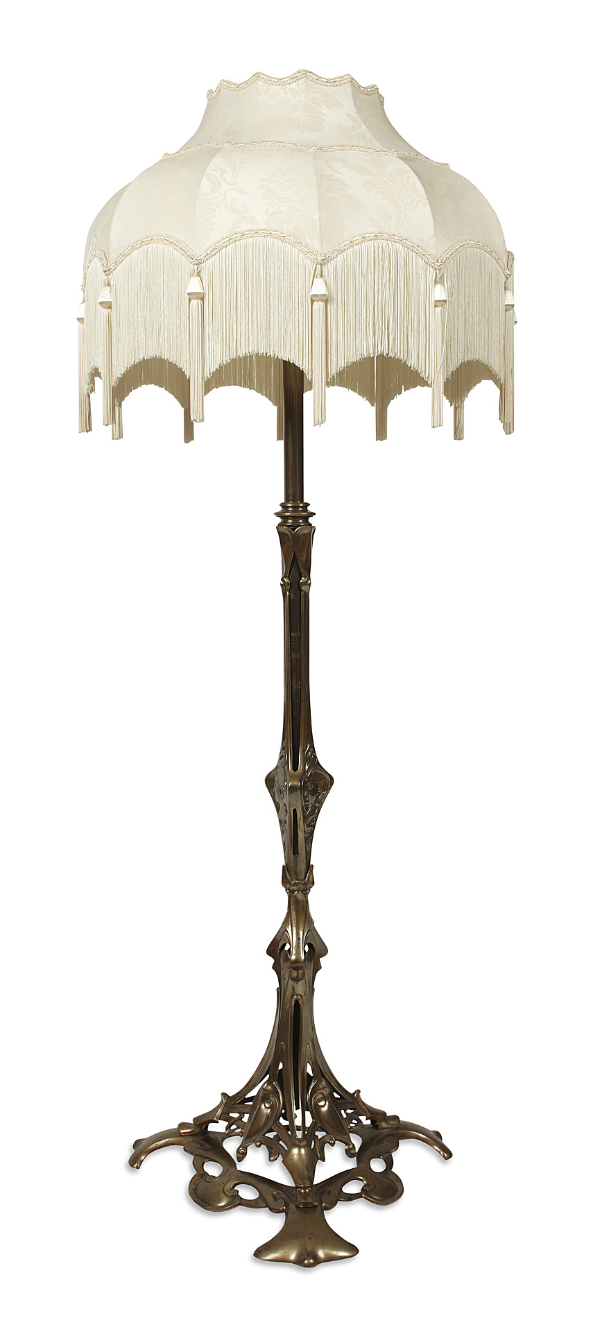 the shaped column support cast with masks of Art Nouveau maidens, raised on a pierced and tapered base with bracket feet