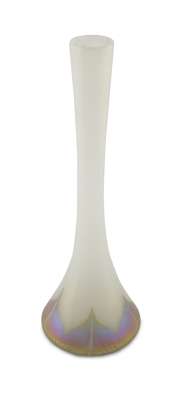 of slender tapering form with spreading base, the opaque iridescent body with pulled 'feathered decoration around the base, etched maker's marks under foot 4424 J./ L.C.TIFFANY/ FAVRILE
