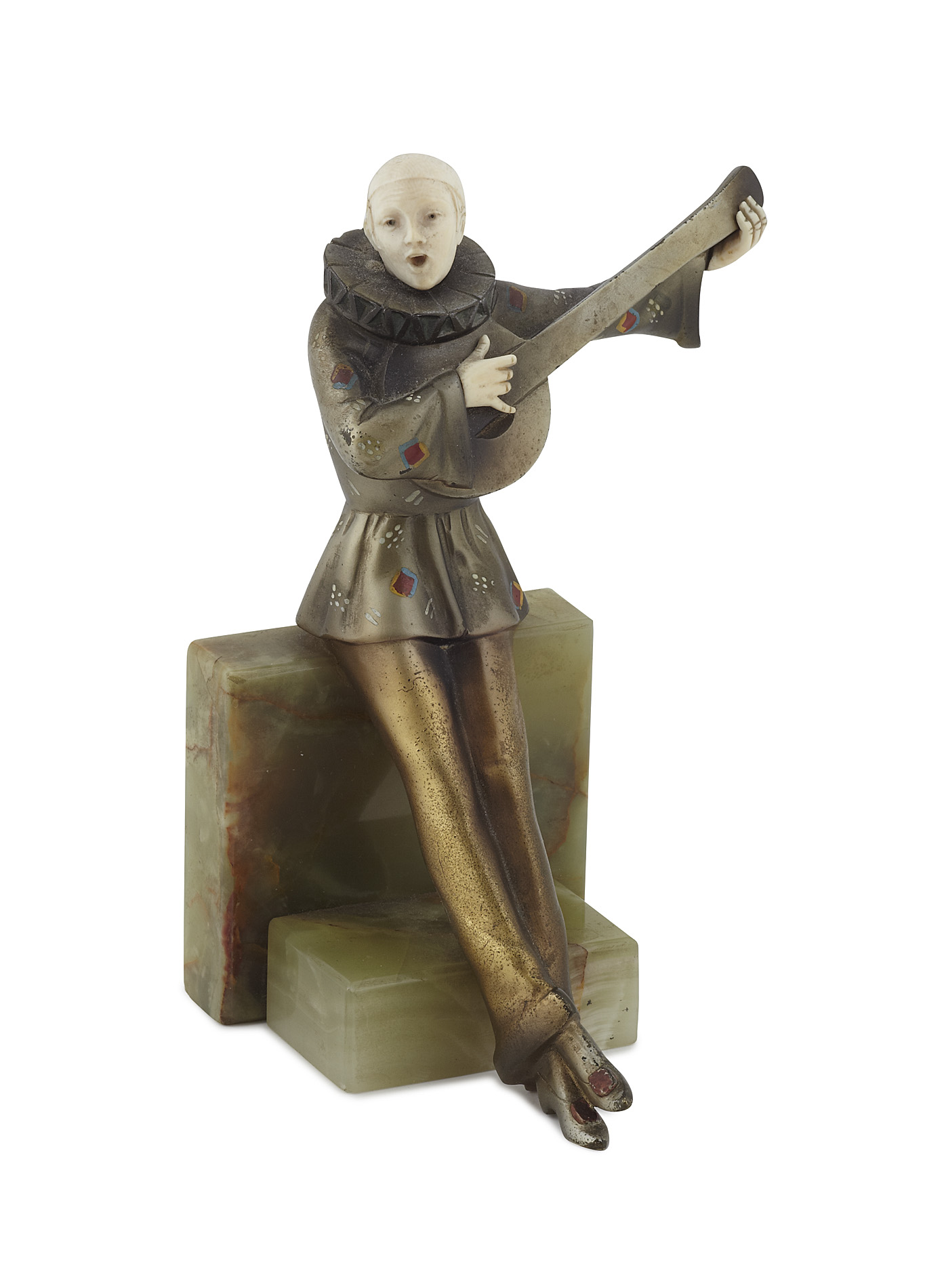 depicting a pierrot modelled playing a lute, the bronze painted with stylised motifs by Crejo, seated on an onyx plinth, painted mark 'Crejo'