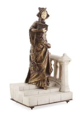 cast as a female figure wearing medieval dress and holding a jewellery casket, descending a white marble staircase with balustrade, the whole raised on turned feet