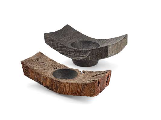 of dished oblong form, with circular bowl, 28cm high; stamped J.B. PARTRIDGE; and a SMALLER DISHED VESSEL, in un-scorched wood, unsigned, 31.5cm across; also a book 'JIM PARTRIDGE' by Alison Britton and Katherine Swift (3)