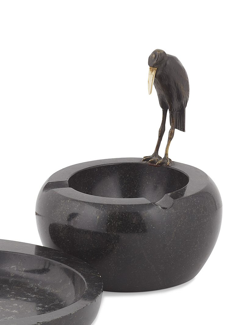 the black fossilized marble tray mounted with a standing bronze stork with ivory beak