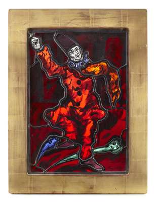 'COMMEDIA DELL'ARTE: TOTENTANZ', STAINED AND LEADED GLASS PANEL, CIRCA 1990