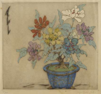 coloured drypoint etching, signed in pencil lower right ELYSE ASHE LORD, 35/75, 35cm x 32cm and 'ZINNIAS', coloured drypoint etching by the same hand, signed in pencil lower right ELYSE ASHE LORD, 100/100, 30cm x 32cm (2)