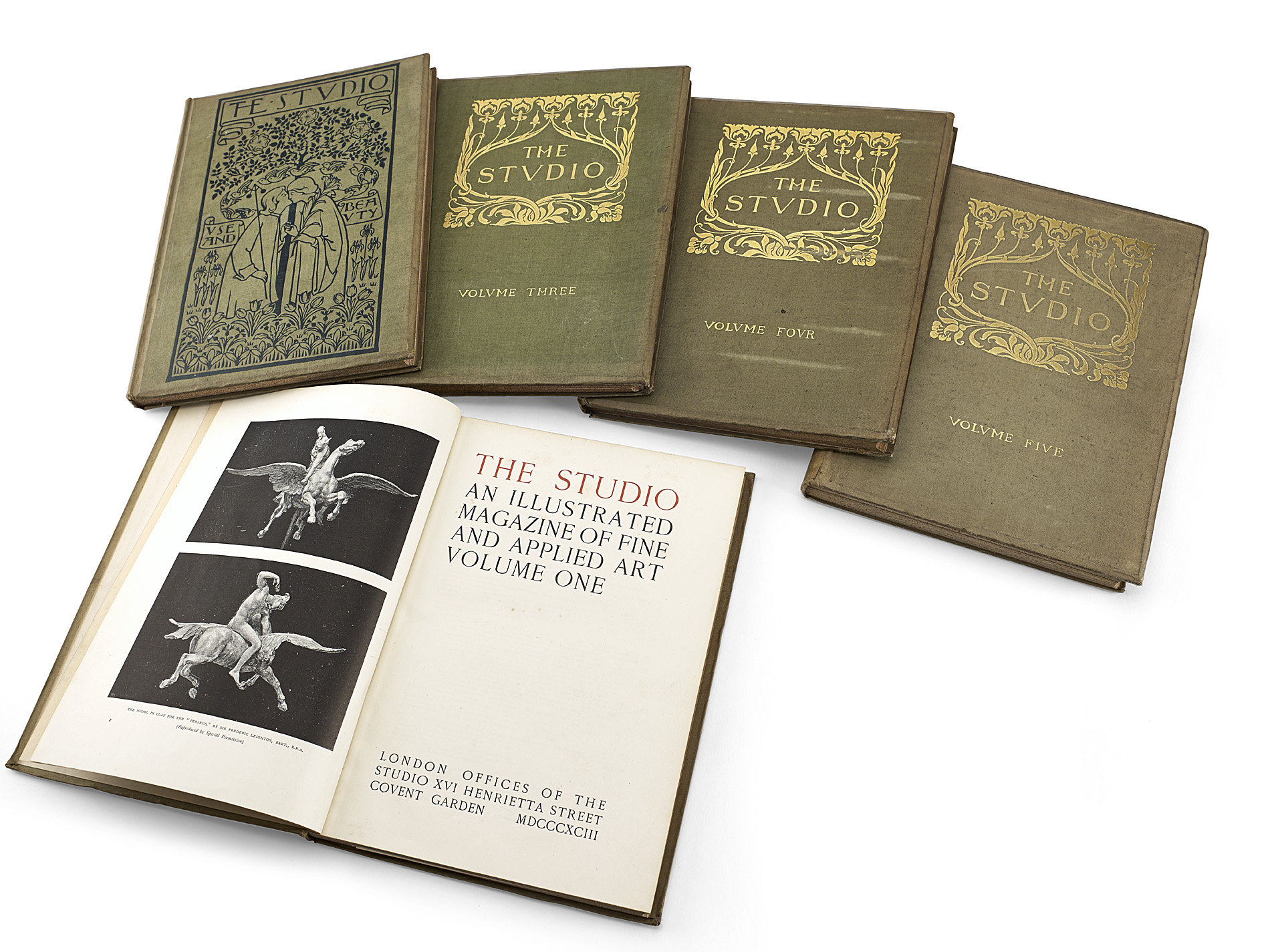 London: The Studio, 1893-1963. Full run of volumes 1-78, 4to, green cloth gilt (volume 67 in red half morocco, volumes 1 and 2 black printed cloth), volume 79 in original parts (March-July 1920 only) with original covers, volumes 81-87 and 94 in green cloth gilt, volume 95 in original parts (January-June only), run of volumes 132 and 134-148, 8vo, various colour cloth and volumes 155, 156, 159, 160, 165 and 166, 8vo, blue or green cloth, spines gilt; and General index to The Studio. London: [1901?]. 4to, quarter calf; [Idem] General index to The Studio. London: Simms and Reed, 1979. 4to, green cloth gilt; sold not subject to return