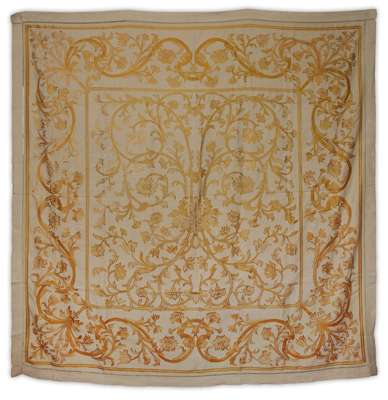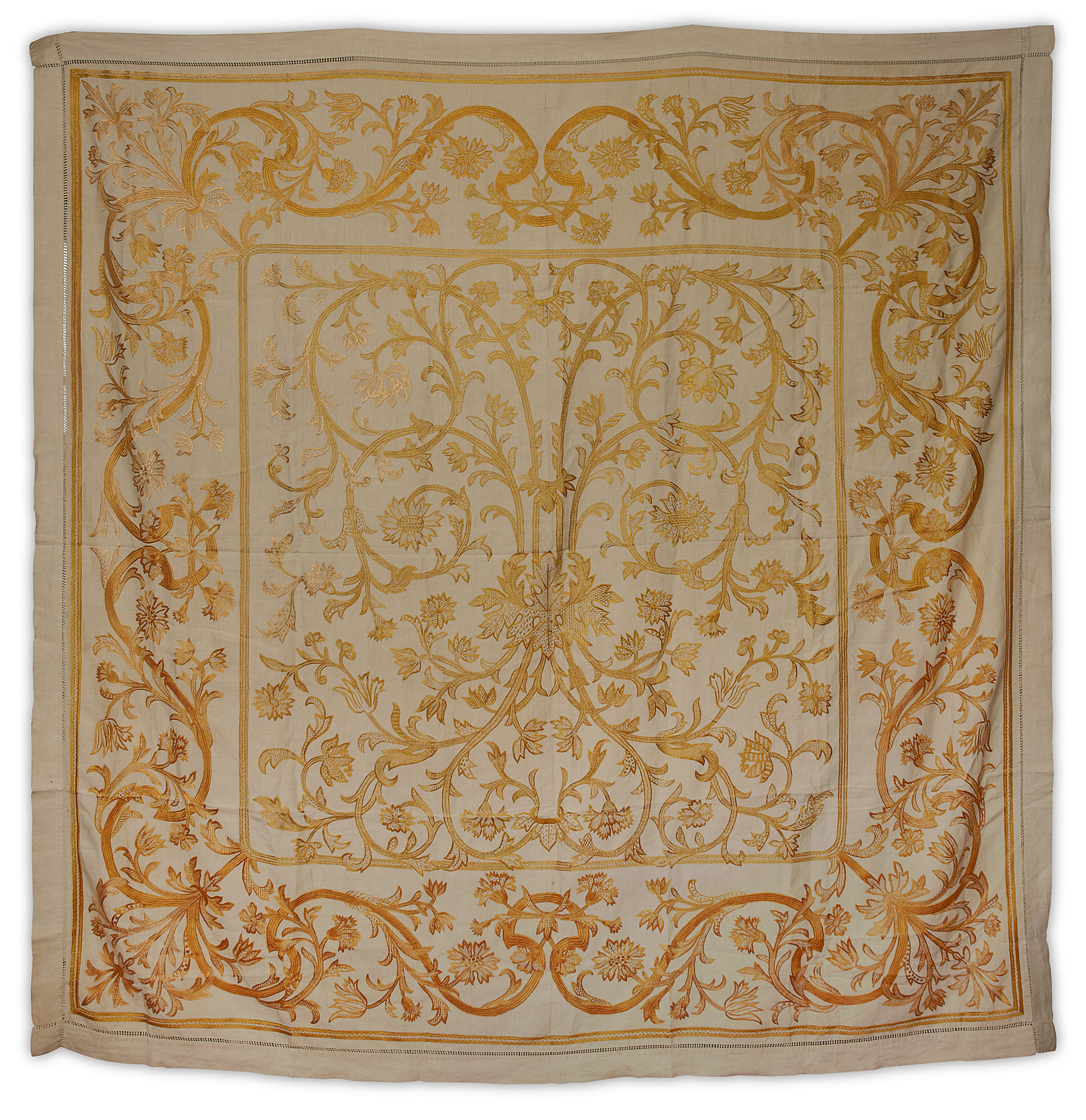 linen, embroidered in yellow silk threads with an allover design of flowering tendrils