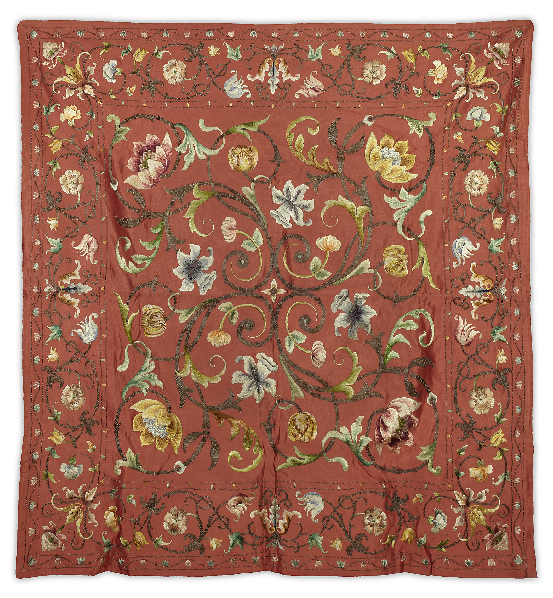 worked in coloured silks and metal threads with an allover design of flowering tendrils, and reserved on a russet silk ground