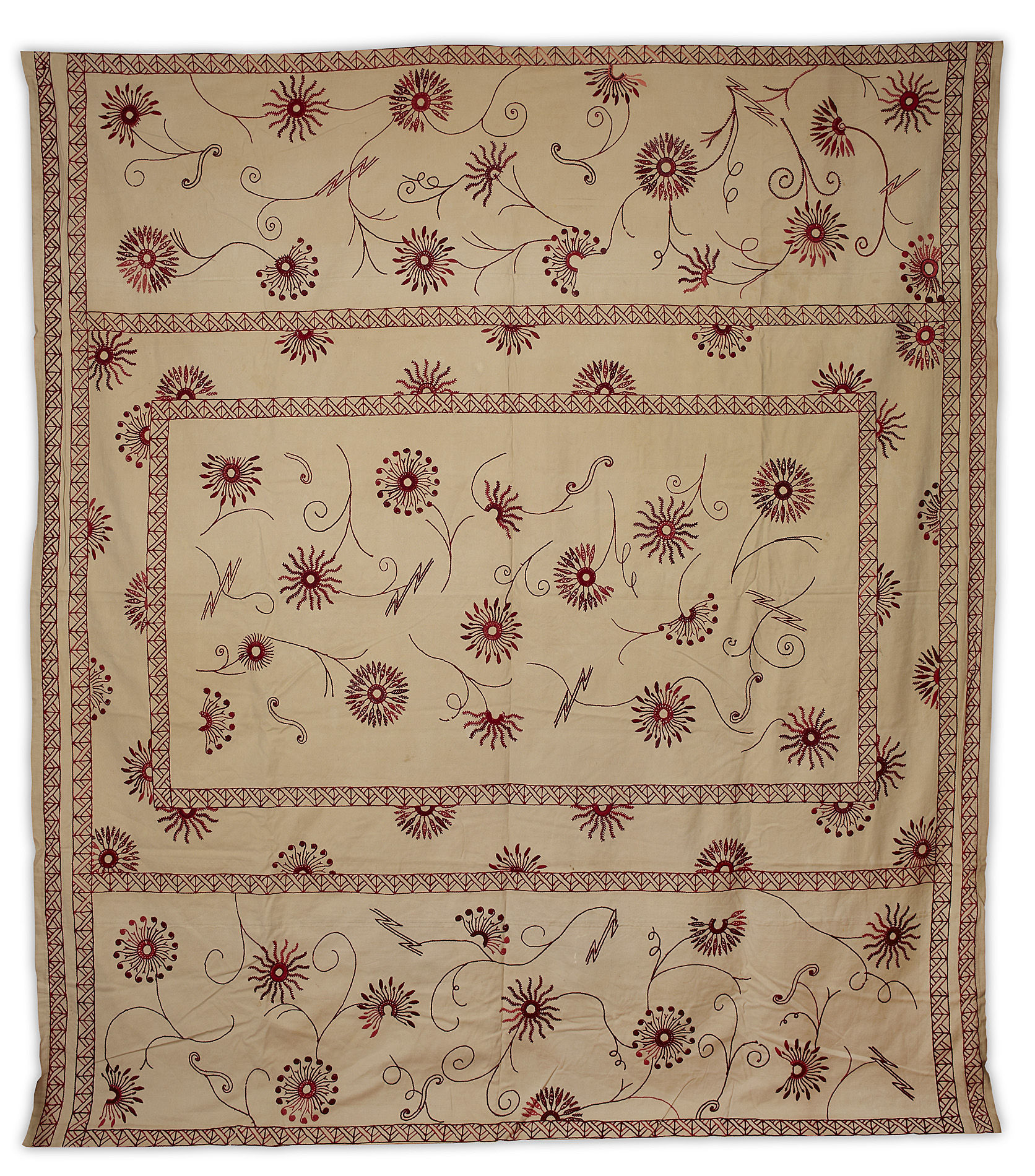 the buff cotton ground with allover rectangular panels enclosing stylised floral sprigs worked in ruby red threads, lined