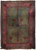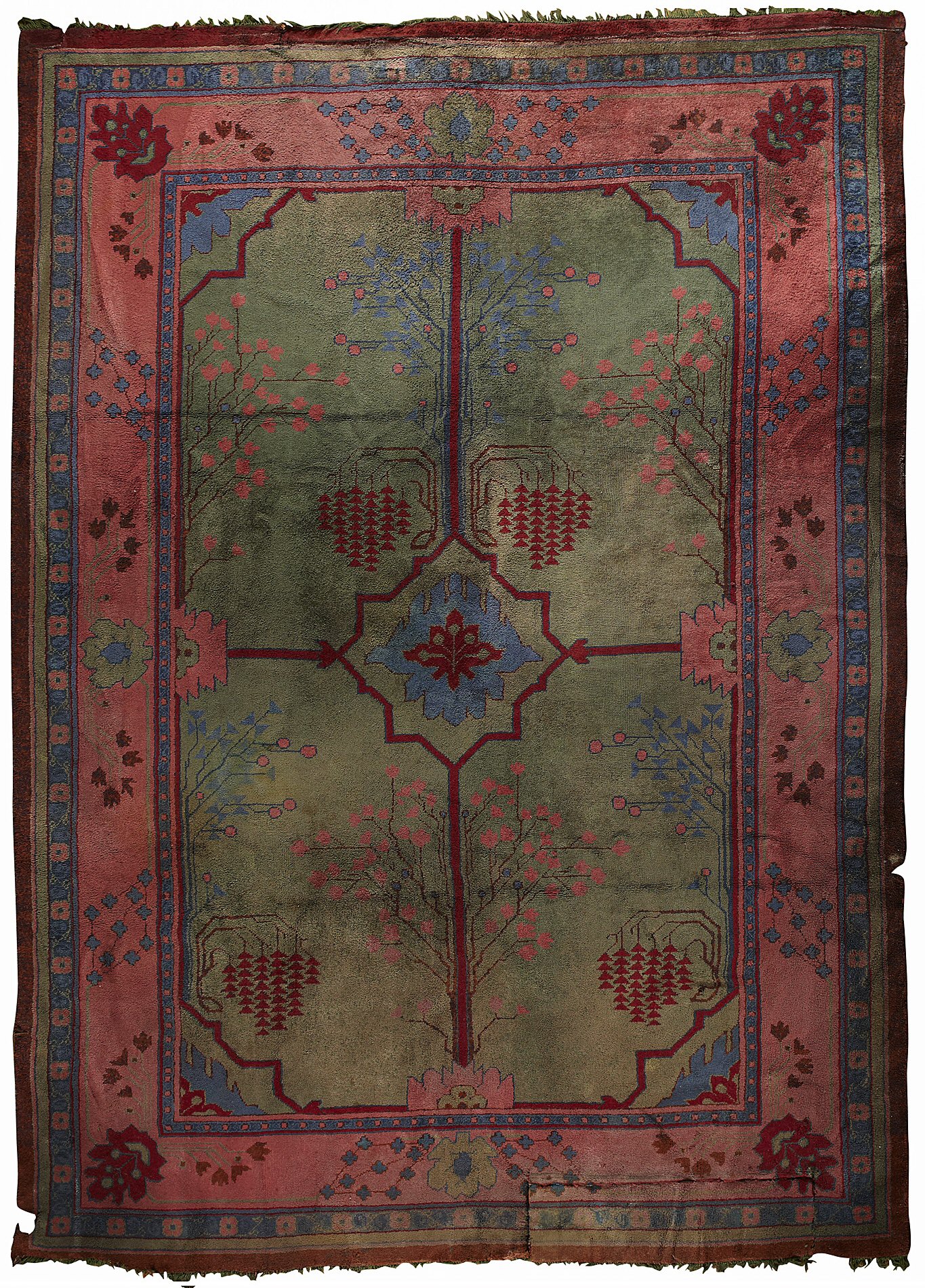 the sea green field with central blue palmette and red line cruciform design, within salmon pink palmette and vine border between bands