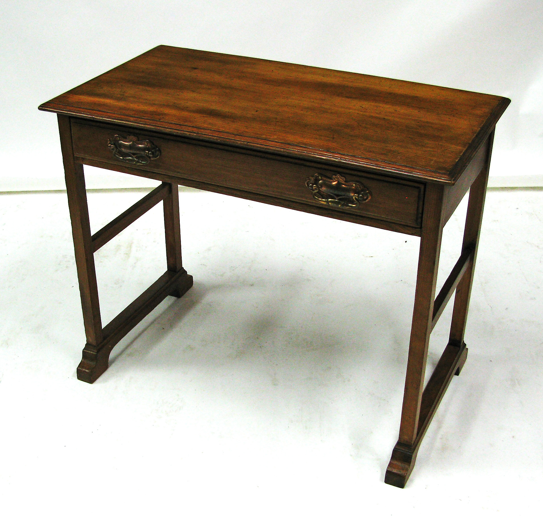 the rectangular top above a single drawer on square legs linked by stretchers