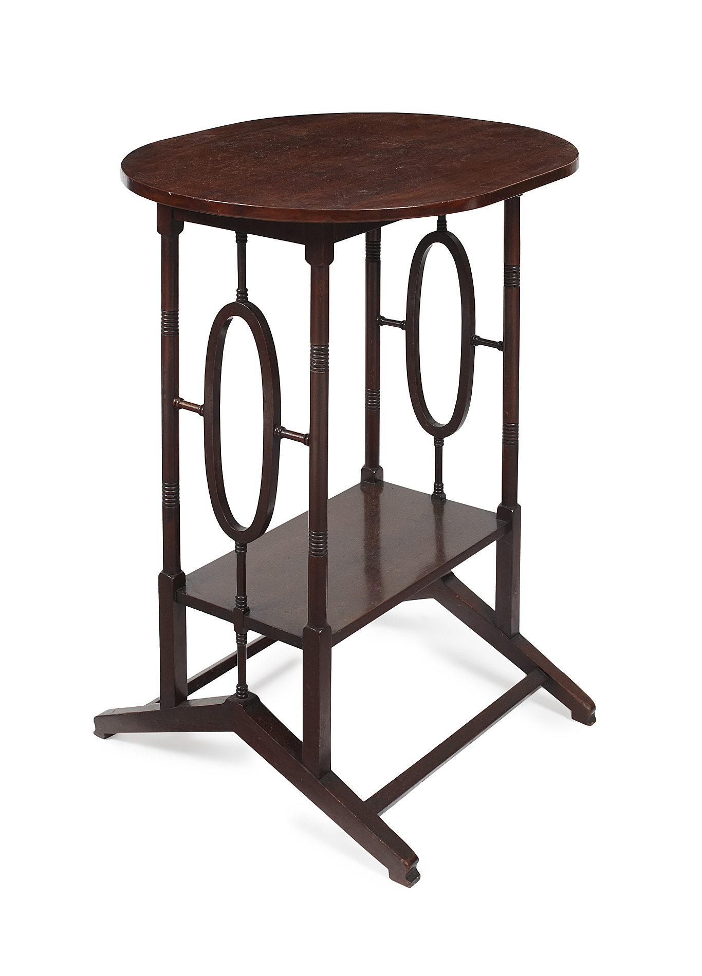 the oval top on ring turned columns with oval side supports and lower tier, the whole raised on angular legs