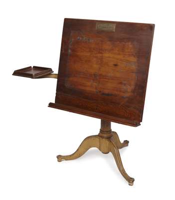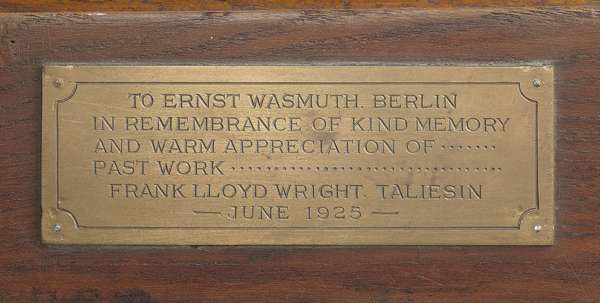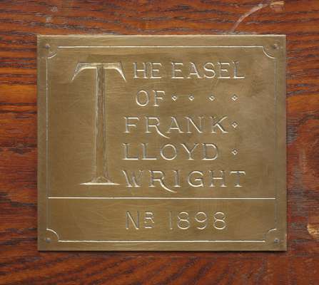 Note: In October 1909 Frank Lloyd Wright left America for Europe, in part to experience European art and architecture, and also to promote the publication of a folio of his work the following year. The folio, entitled 'Ausgeführte Bauten Und Entwürfe von Frank Lloyd Wright' contained plans and perspectives of buildings from 1893-1909, and was published by the Berlin publisher Ernst Wasmuth. The folio was the first publication of Wright's work to appear anywhere in the world, including the United States and its publication had significant influence on the early modernist architects in Europe including Peter Behrens, Le Corbusier and Walter Gropius. The current lot, an American made easel of late 19th century manufacture, is thought to have belonged to Wright at the time of his European visit and was presented to his publisher Ernst Wasmuth as an appreciation. A faint inscription on the pine board, and a brass plaque mark the presentation and a further plaque on the reverse bears an inventory number and the inscription 'The Easel of Frank Lloyd Wright'. In 1932 Wasmuth is thought to have lent his easel to the Werkbundsiedlung in Vienna. The Werkbundsiedlung was an exhibition involving thirty famed architects from Austria, Europe and America such as Richard Neutra, Adolf Loos, Margarete Schütte-Lihotzky, Otto Niedermoser, Ernst A. Plischke and Gerrit Rietveld, who completed 70 fully furnished houses for the exhibition, before they were made available for sale to potential residents. In the 1940s the easel was passed to Dr Hans Herzfeld for a post-war exhibition at the Kärntnerstrasse in Vienna. Until the mid 1980s it was in the possession of The Westfair Estate in Malibu, a Savings and Loan company who had been buying architectural memorabilia from Europe for display. It was exhibited there until the mid 1980's when the Estate and its holdings were sold and the easel returned to Europe.