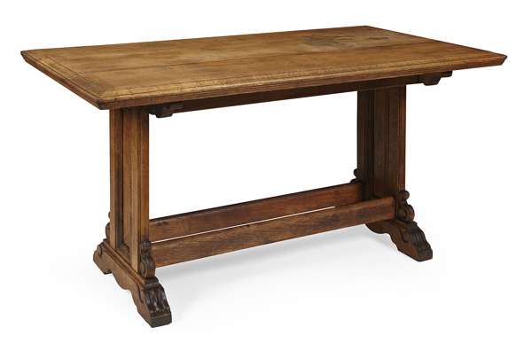Note: These library tables demonstrate similar characteristics to Italianate designs by Lorimer for a library at Fettercairn House in 1898. Photographs of the Drawing Room at Kellie Castle in 1906 for Country Life also show the base of a library table with a similar base to the current lot.