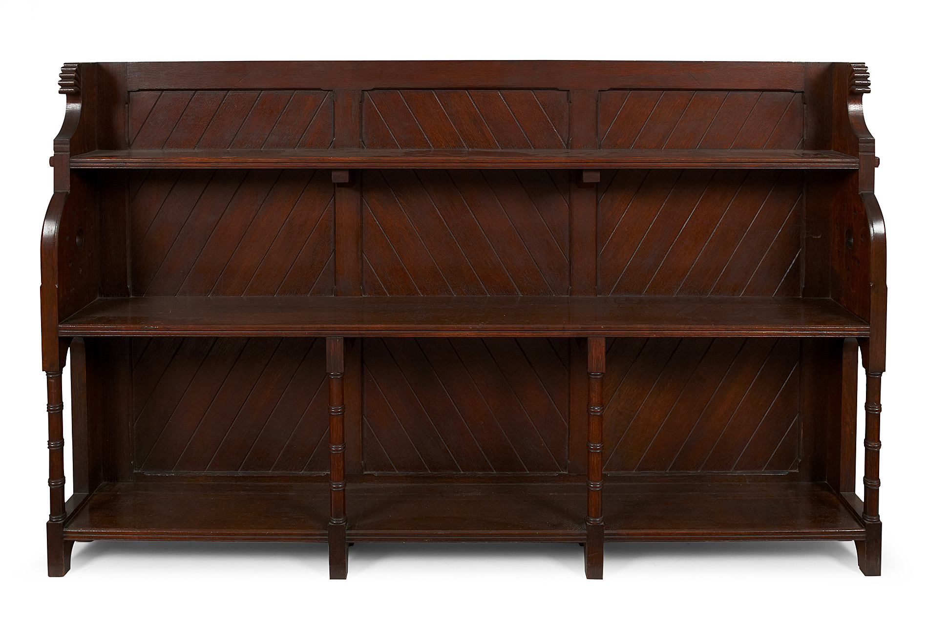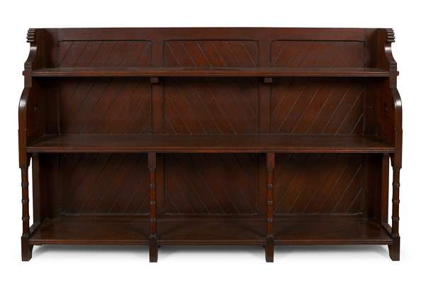 the panelled back with tongue and groove panels and three open shelves, the pierced sides with foliate brackets