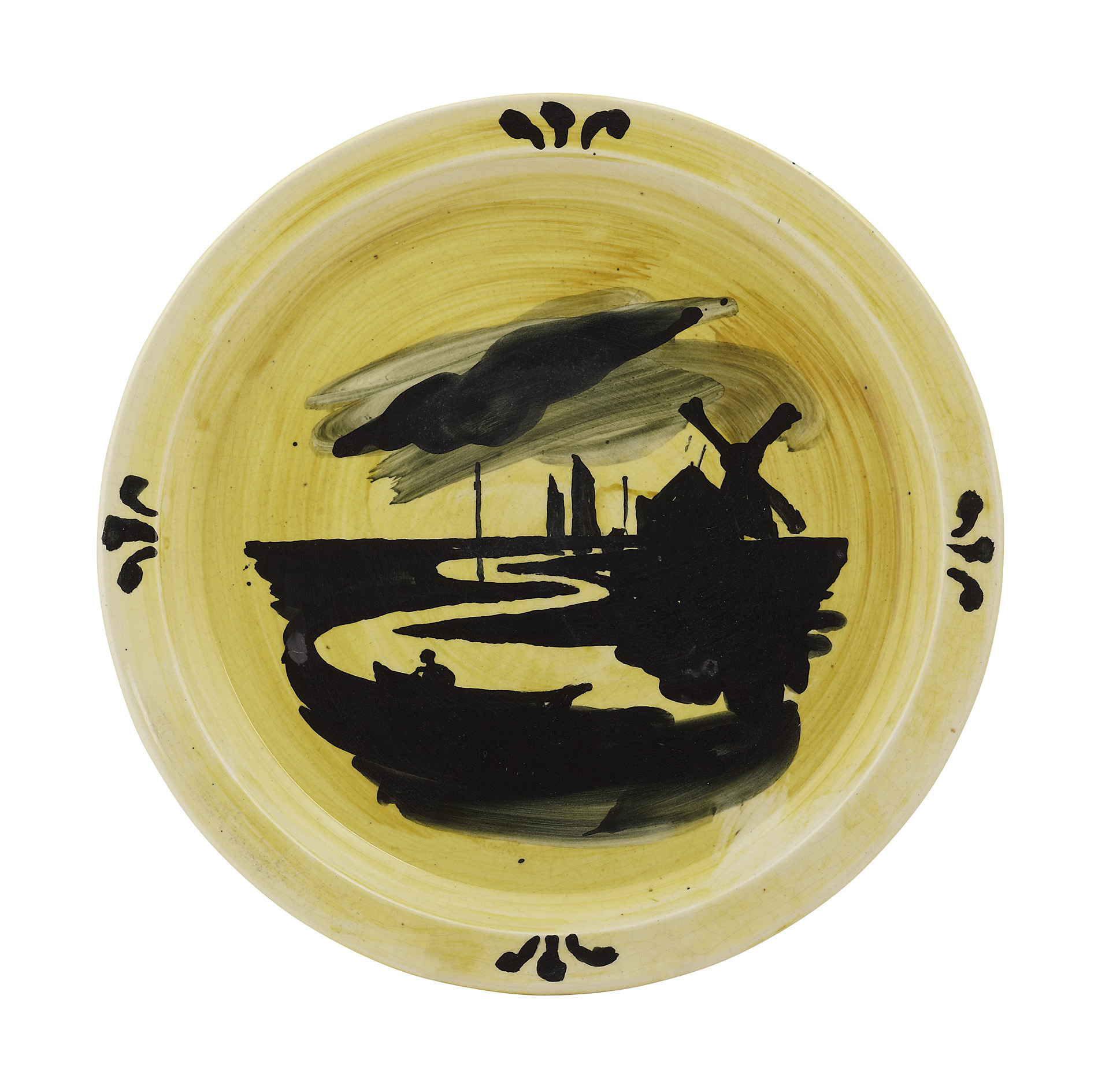 hand painted ceramic plate, bears painted inscription to base JOHN PIPER/ X./ 82/ HOMAGE TO JOHN CROME/ FULHAM POTTERY